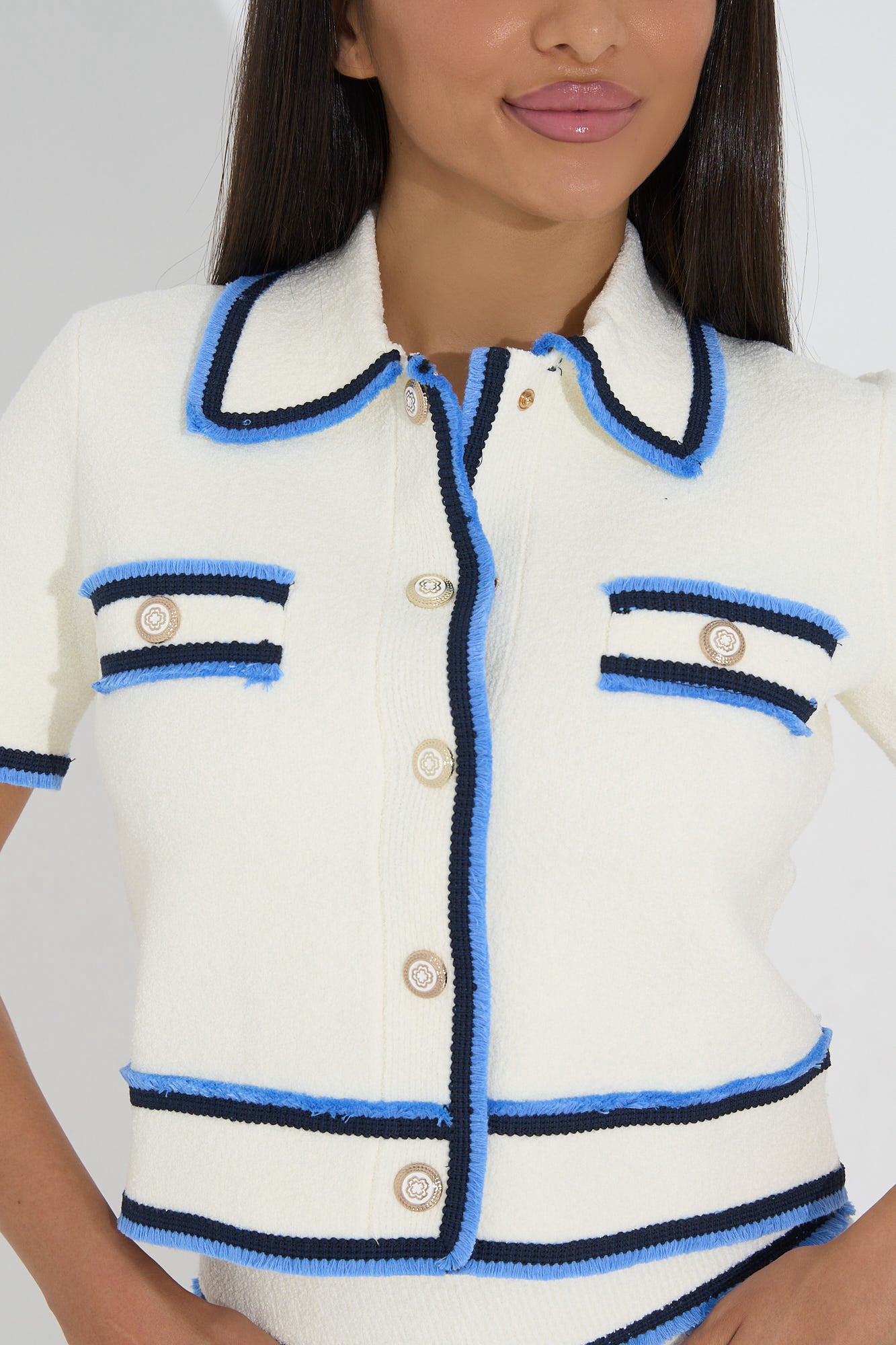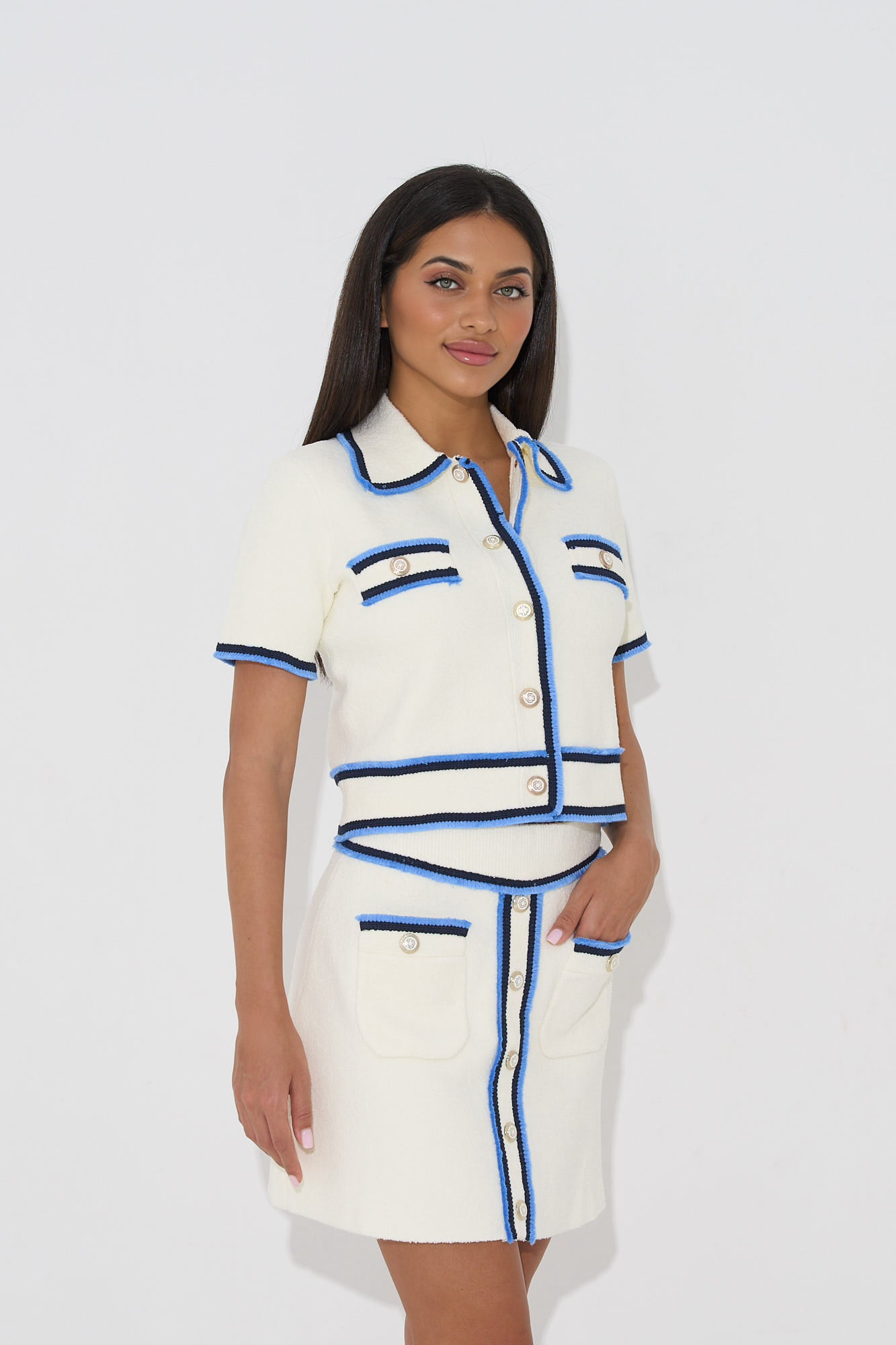 Set elegant doua piese, compus din jacheta scurta cu maneca scurta si fusta mini. Detaliile albastre si negre, nasturi metalici si croiala moderna ofera un aer chic, perfect pentru un look urban sofisticat.